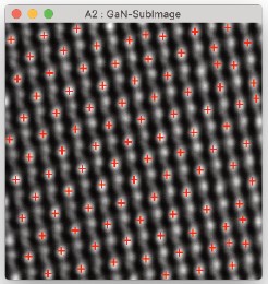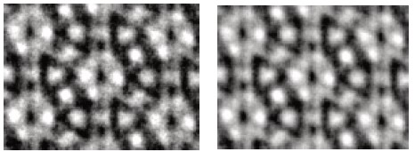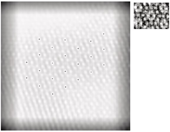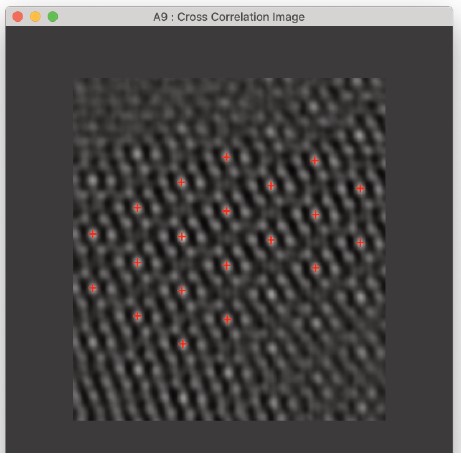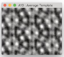 これにより、-1から+1の範囲の値を持つ新しい画像が得られ、値が1に近いほどテンプレートに類似した領域であることを意味します。図10は、テンプレートが挿入された相互相関画像を示しています。これらの位置を使用して、元のデータから領域を抽出し、単位セルの平均画像を取得できます。平均テンプレートを図11aに示します。比較のために、ウィーナーフィルタリングされた画像から得られた平均テンプレートを図11bに示します。