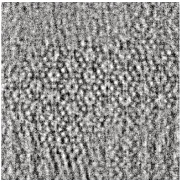 結晶構造が非結晶領域にまで広がるなどの明らかなアーティファクトは、フィルターが不適切であることを示しており、多くの場合、ノイズを過大評価した結果、フィルタリングが過剰になったことが原因です。実験画像の場合、信号(「結晶画像」)は未知であるため、フィルターが実験データに与える影響を定量的に評価することは困難です。