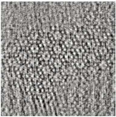 図3. 電子線によって急速に損傷を受けているゼオライトの実験画像。中央部はまだ結晶状態にある部分を示している。非晶質の「ノイズ」が大量に存在するため、結晶領域から有意義なデータを得ることは困難である。