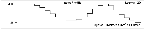 このコーティングは、反射率が低く非常に広い波長範囲をもっています。ここで、線形プロファイルが最良かどうかという疑問が生じます。この疑問を探るために、最適化を使うことができます。これは TFCalc のユニークな機能で、光学的な厚さを固定したまま反射率を最適化します。1つの連続的な最適化ターゲットを使います: 3-20 ミクロンで R=0。可能なかぎり反射率を均一にするために、メリット関数のベキ数を 16 に設定します。驚くべきことに、結果のインデックスプロファイルは正弦曲線の一部のように見えます: