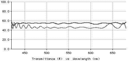 このコーティングはガラス (インデックス 1.52) に埋め込まれ、光の入射角は 45 度です。次のグラフでわかるように、これは入射光を分割します。S と P 偏光の反射率 (および透過率) は、波長が 420 nm と 680 nm の範囲で 45% から 55% になり、非常に広い帯幅です。