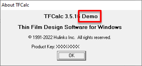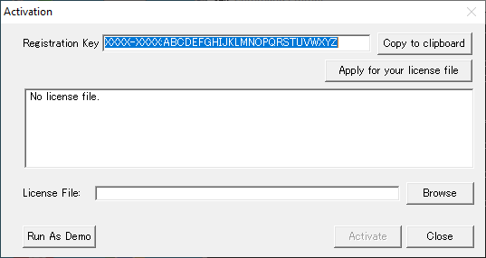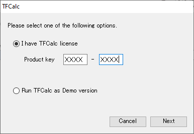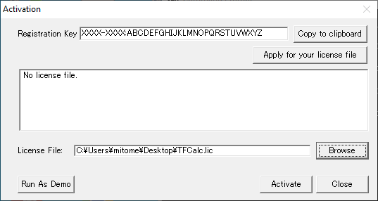 Web のフォームに登録キーと必要な情報を入力し、送信します。 ライセンスファイルを適用するまで、TFCalc はデモ版として動作します。 デモ版で動作している場合、About TFCalc の画面に「Demo」と表示されています。