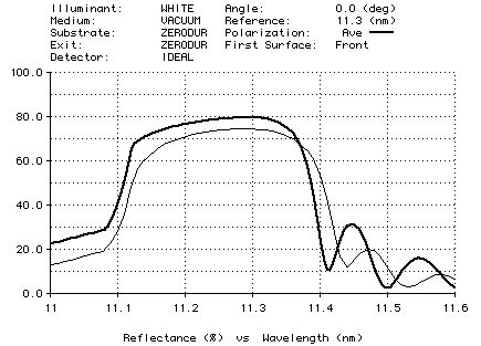 スペクトルの EUV 部分の物質は1に近い屈折率です。それゆえ、ミラーの作成には多くのレイヤーが必要になります。1つのインデックスのレイヤーから他のインデックスのレイヤーへの各転移は、小さな反射を生み出します。著者は Zerodur 上のベリリウム(Be)とモリブデン(Mo)の交互のレイヤーからなる 80 ピリオドのデザインから始めています。また、一番外側のレイヤーの上に自然の酸化物 (BeO) があります。このコーティングの式は (AB)^80 C で、A=Mo、B=Be、C=Be です。レイヤーの厚さは Mo が 2.3、Be が 3.4 nm、BeO が 2 nm です。次のプロット(細い方の曲線)で分かるように、この 161-レイヤーコーティングの、波長 11.3 nm における反射率は 74.5% です。それゆえ、9つのミラーは入射光のわずか 7% しか反射しません。