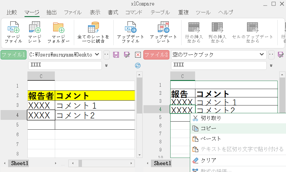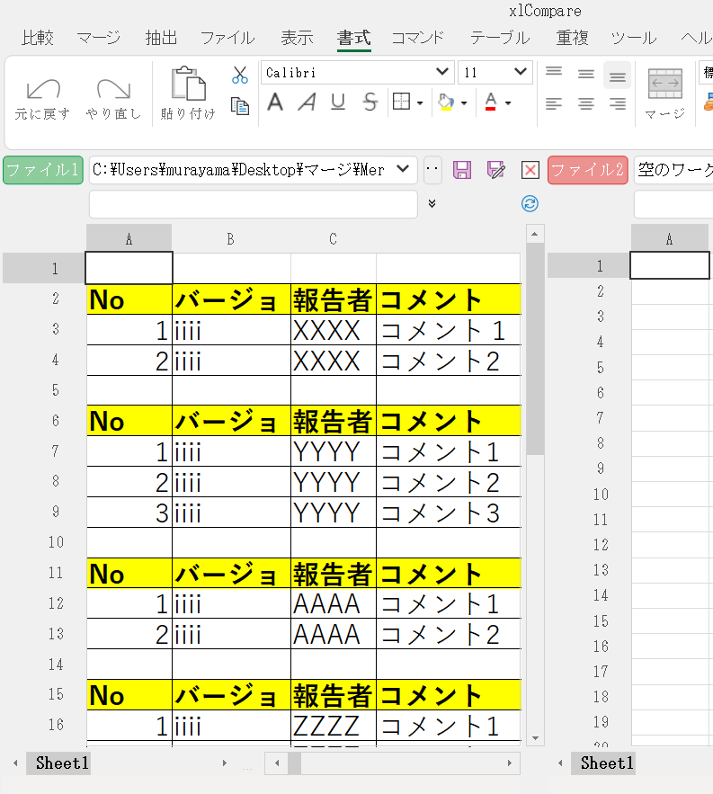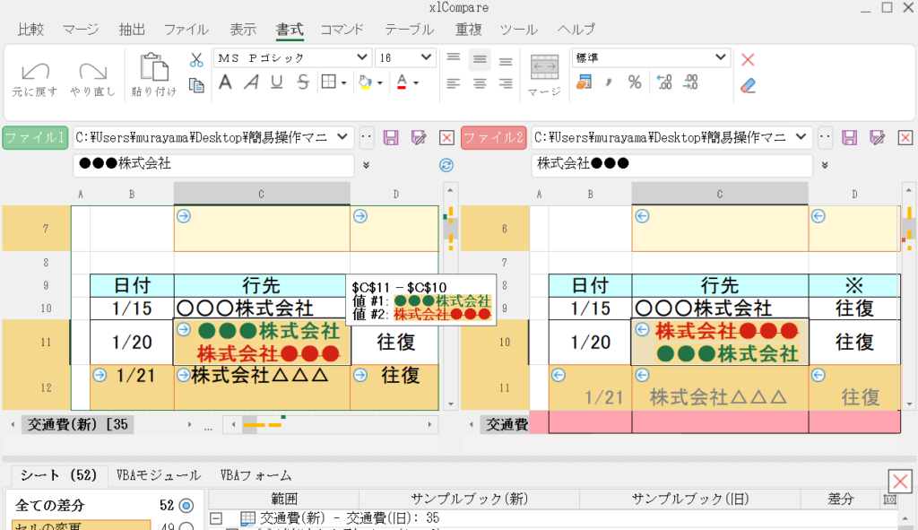 比較したファイルを xlCompare 上で左右に並べ、追加・変更・削除を背景色でわかりやすく表示します。