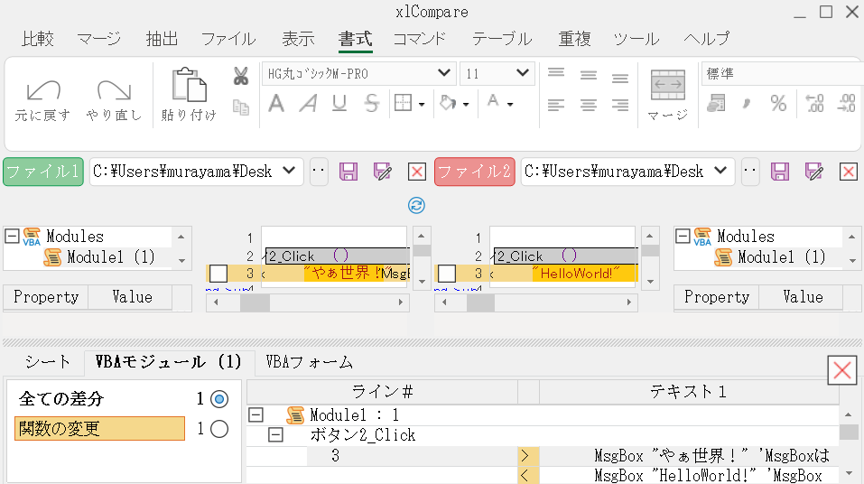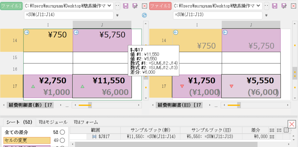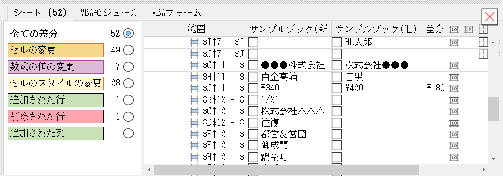 セル内の文字列だけではなく、計算式の変更や計算結果の比較もできます。また、VB モジュールも簡単に比較できます。