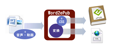 変換対象の Wordファイル (.doc/.docx) と、収録する音声・動画ファイルを保存したフォルダ、EPUB で使用するスタイルファイル、表紙の画像ファイル、そして出力先のファイル (EPUB) の情報を指定するだけで EPUB が完成します。
