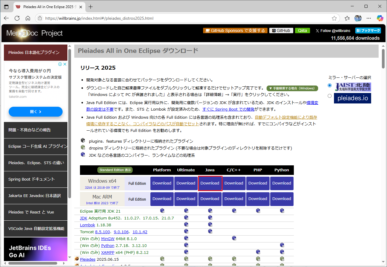 | 2.Pleiades All in One Java | … | pleiades-2025-06-java-win-64bit-jre_20250615.exe (1.25 GB) |