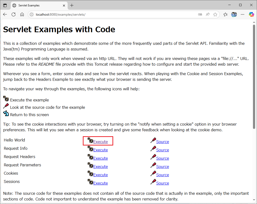 –> [Servlet Examples with Code] のページが表示されるので、”Hello World->Execute” を選択します。