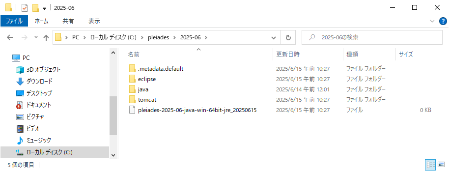 - ここでは、”2.pleiades-2025-06-java-win-64bit-jre_20250615.exe (1.25 GB)” をダウンロードした後に、pleiades-2025-06-java-win-64bit-jre_20250615.exeを実行します。