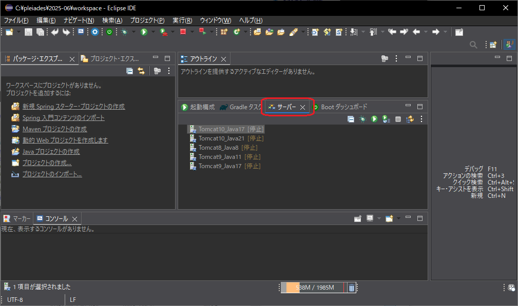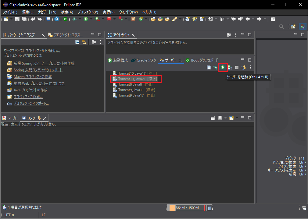 - ”サーバー”タグから該当するTomcatのバージョンを選択し「サーバーを起動」をクリックします。