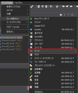 ※サーバータグが表示されない場合は、上部メニューから「ウインドウ」「ビューの表示」「サーバー」を選択することで表示できます。