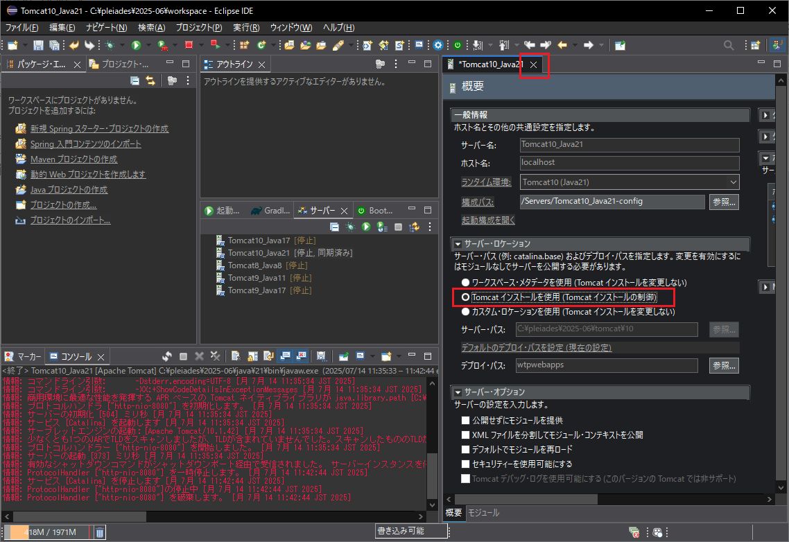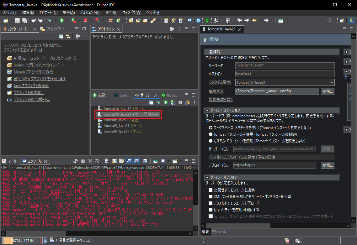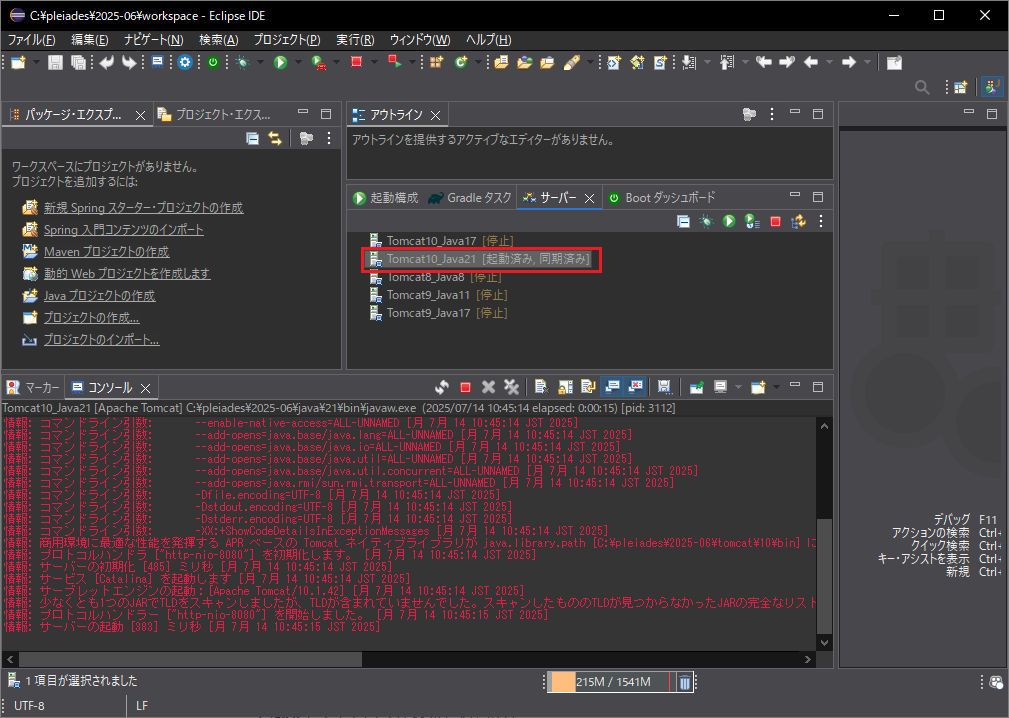 ここでは、Tomcat10,java21を起動します。