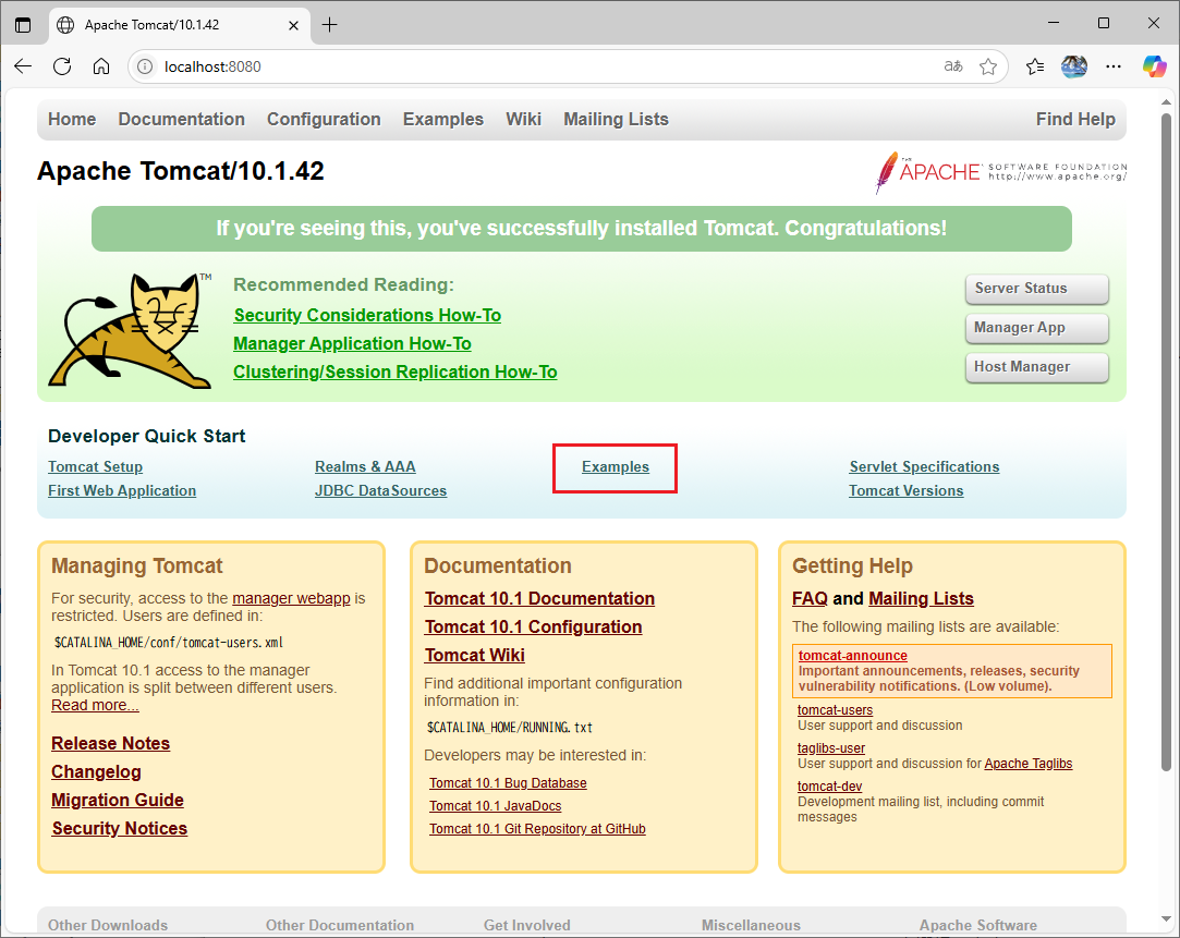 –> [Apache Tomcat Examples]のページが表示されるので、「Servlets examples」を選択します。