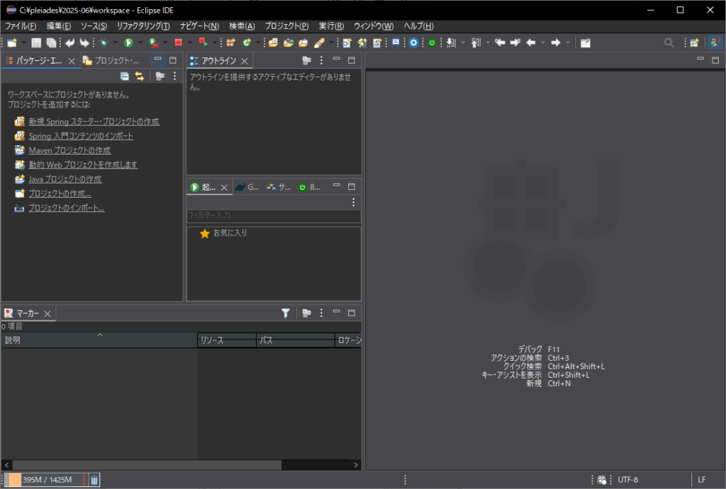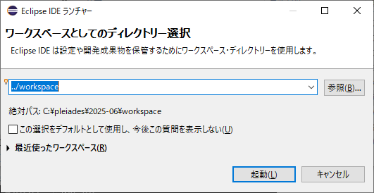 - eclipse フォルダーにある eclipse.exe をダブルクリックします。–> [ワークスペース・ランチャー] が起動されるので、ワークスペースを “