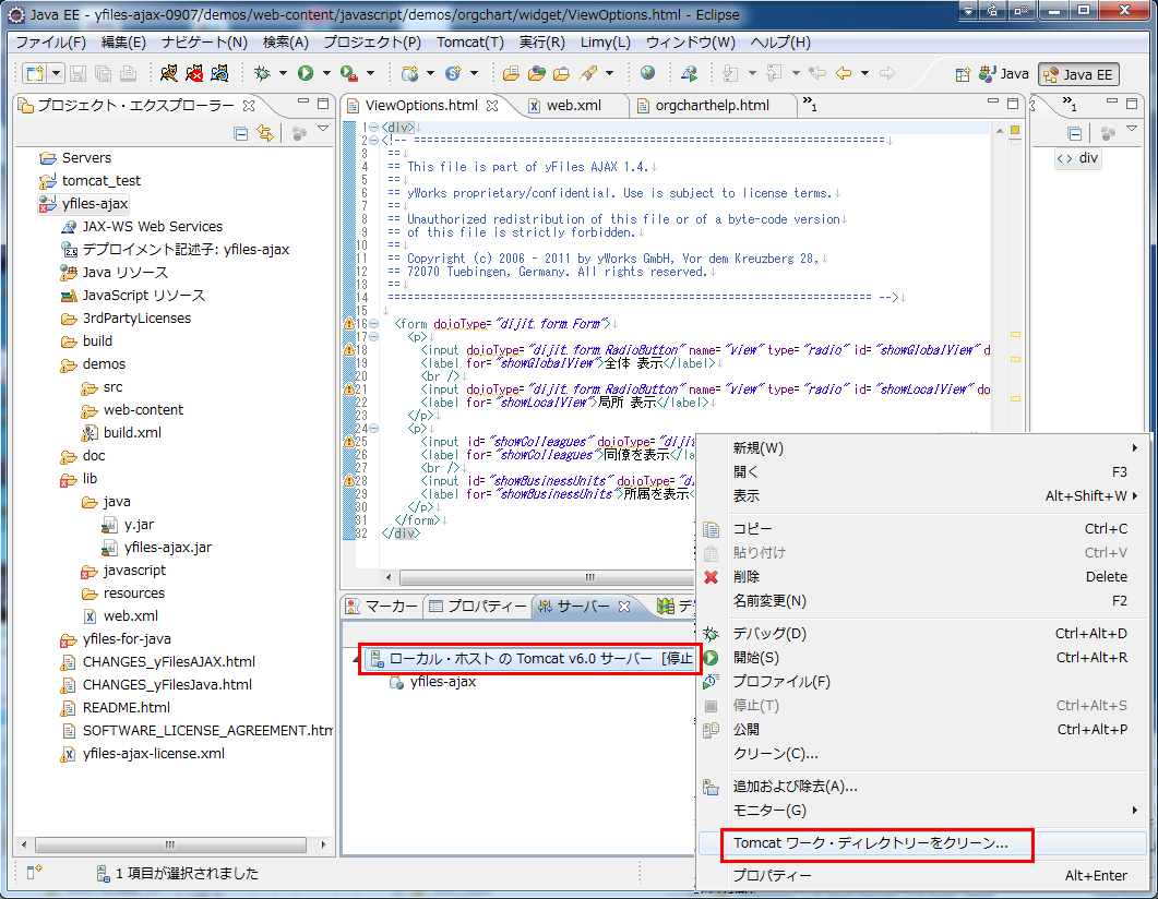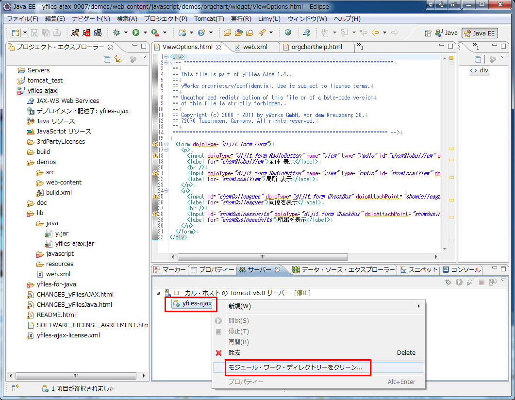 - “yfiles-ajax” 上で右クリックして、”モジュール・ワーク・ディレクトリーをクリーン” を選択します。