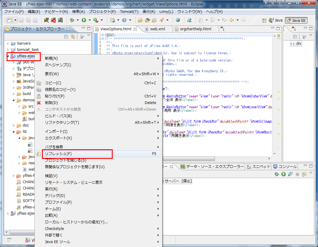 - プロジェクト・エクスプローラの “yfiles-ajax” 上で右クリックし、”リフレッシュ” を選択します。