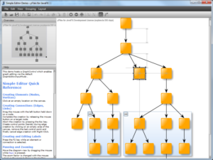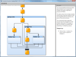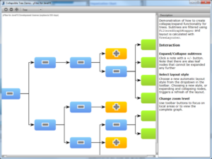 Collapsible Tree デモアプリケーションは、多数のノードで構成されたツリーを読み込みます。読み込まれたツリーの枝は展開したり折り畳んだりすることができます。各ノードは、現在の状態をあらわすカスタムアイコンで描画されます。展開または折り畳み操作を行うと、グラフは定義可能なレイアウトアルゴリズムで再描画されます。