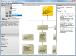 Graph Viewer デモアプリケーションは、ズーム、パン、オーバービュー、追加ノード情報の切り替え等の機能を使ってユーザーがどのように情報をやり取りできるかを紹介するものです。
