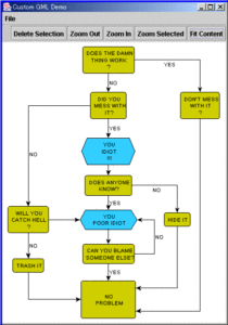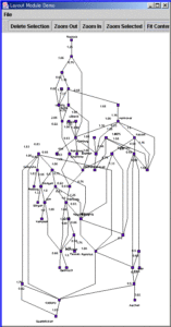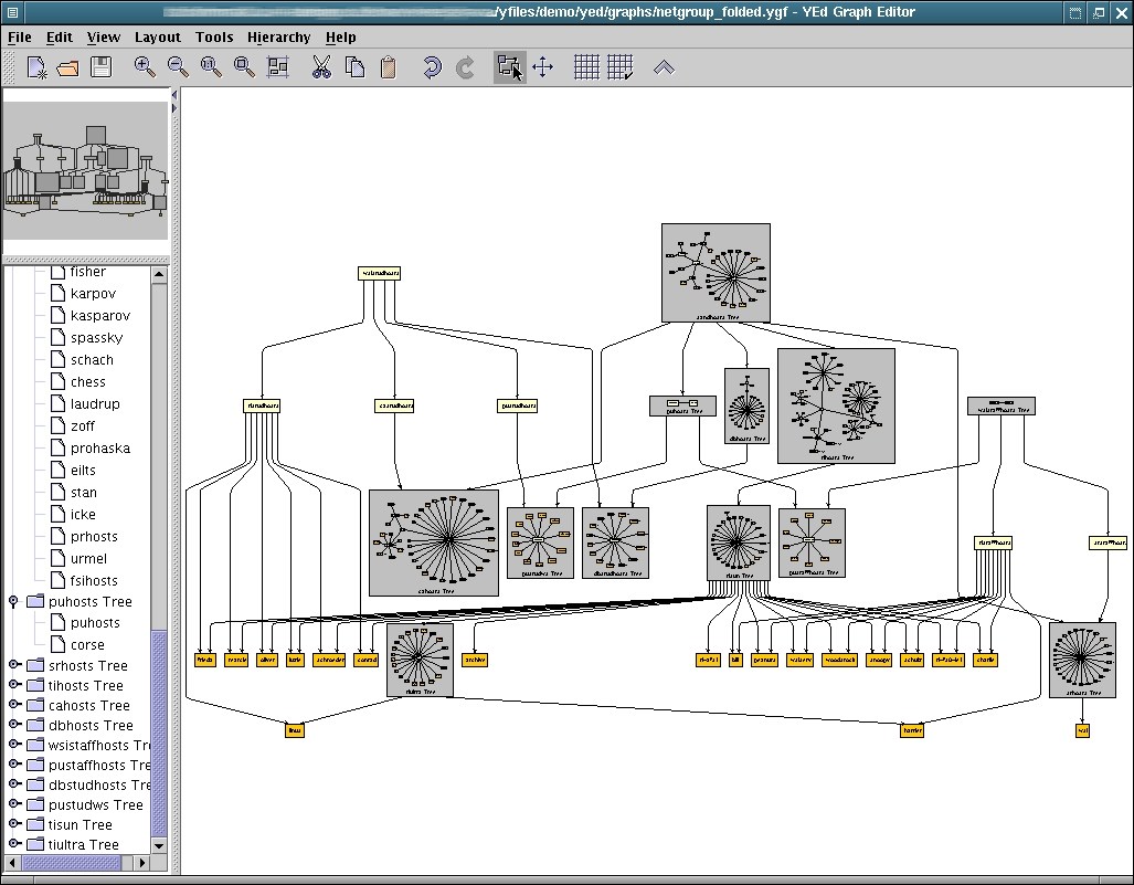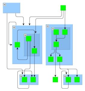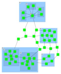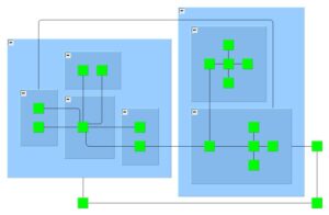 yFiles は、「入れ子構造のグラフ (nested graphs)」という概念をサポートします。すなわち、グラフの各ノードは、それ自身の中に、さらにグラフを含めることができるということです。そこに含まれるグラフは他のグラフと同様に配置できます。以下の画像は、データをより効率的に組織化するこの入れ子構造機能を利用したアプリケーションとダイアグラムの例です。