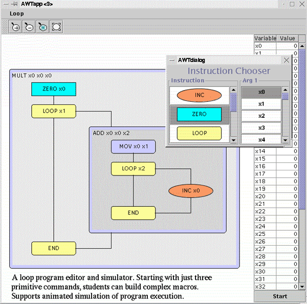 視覚的な LOOP 言語のプログラムのエディタとシミュレータ。ループプログラムそれ自身を表す再利用可能なマクロノードの概念をサポート。