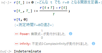 結局、我々のニーズ (静止の速さゼロ) を満たすには、単に「測定時間はゼロ時間ではない (T≠0) 」というルールを作ればよいと分かる。このルールは、微分法でも非常に重要になる。Mathematica では、ルールを満たすコマンドは FullSimplify
