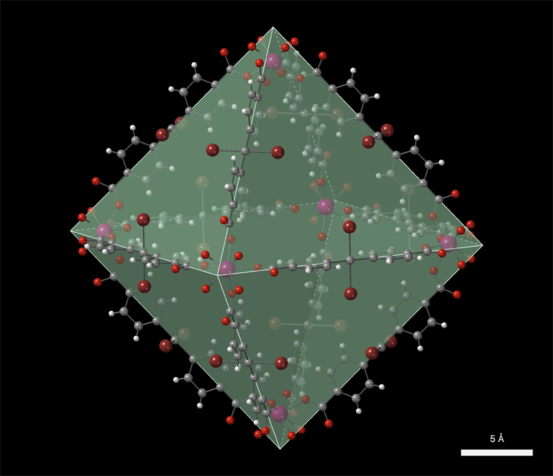 例としては、ZIF(ZIF-1、2、3、3、6など)、UIO-66、HKUST-1(Cu)、MIL-53 などがあります。 以下の図は金属有機構造体 (MOF) の UIO-66(Zn) 構造を CrystalMaker で最適化したものです。