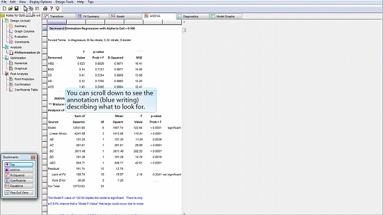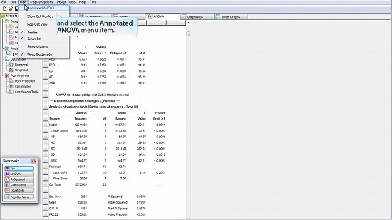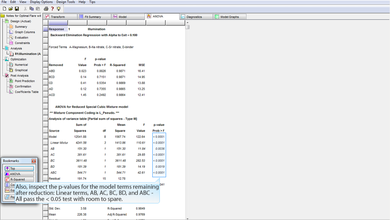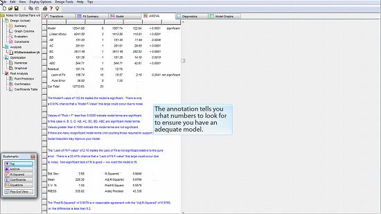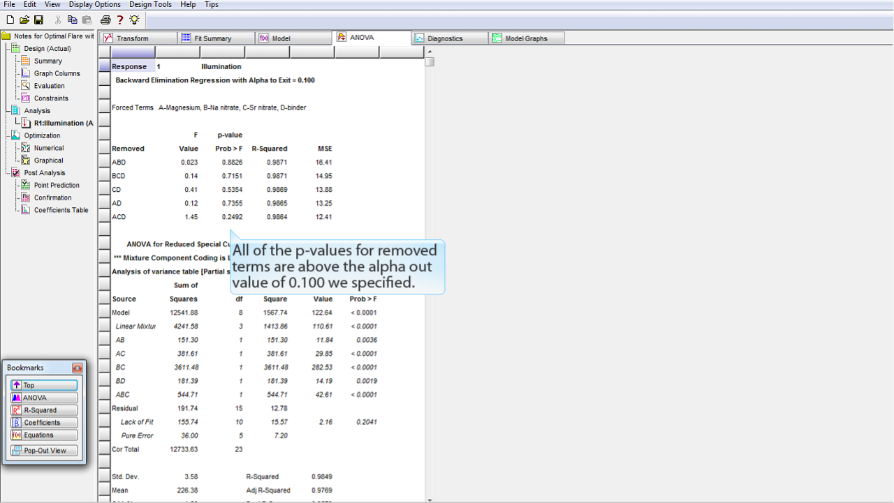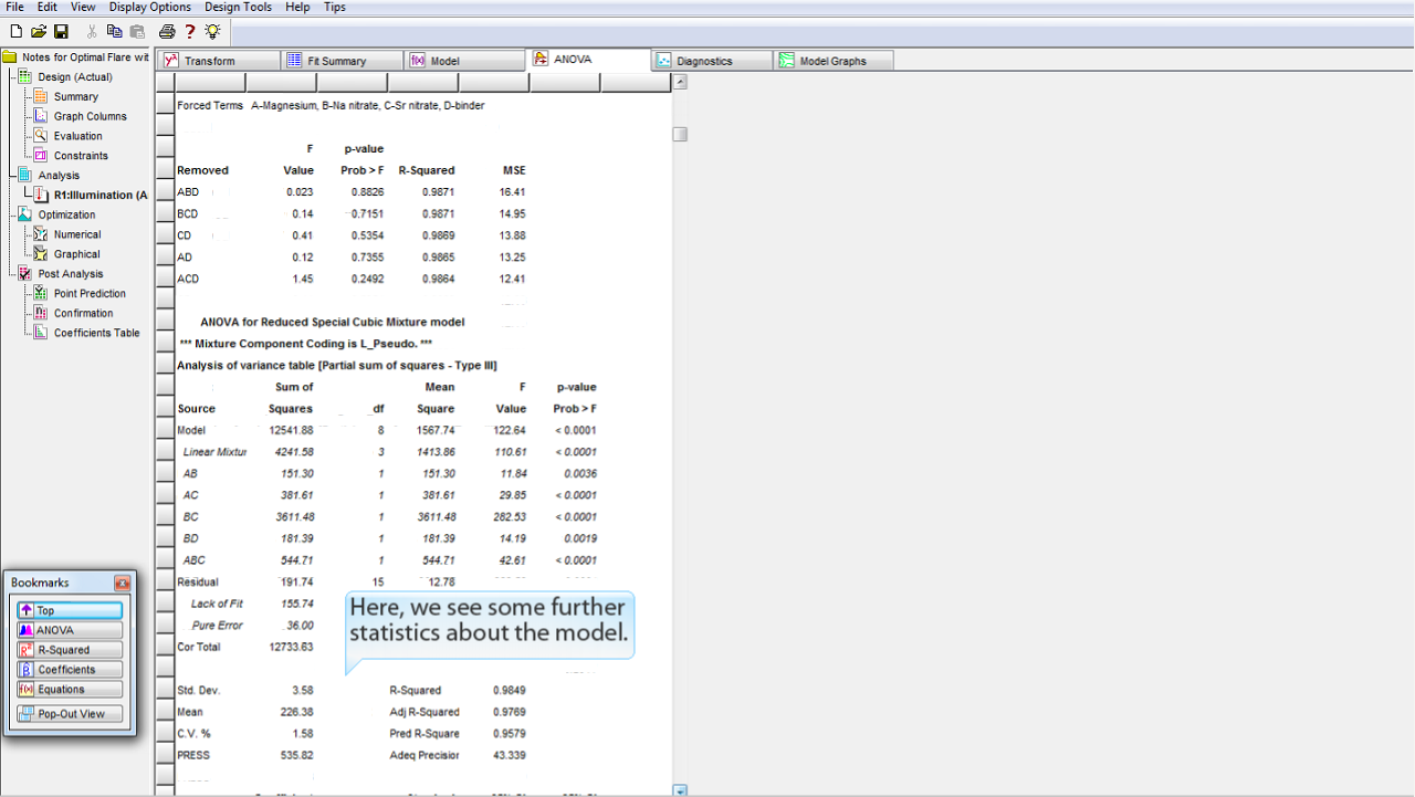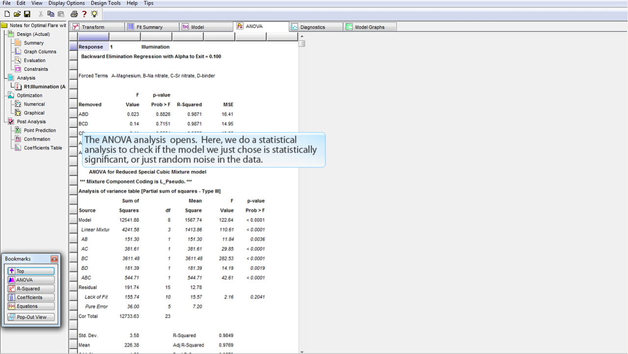 ANOVA 分析が開きます。ここで、選択したモデルが統計的に有意なものか、それとも、データのランダムノイズに過ぎないものかをチェックするために統計的な分析を行います。