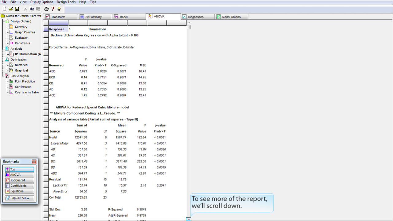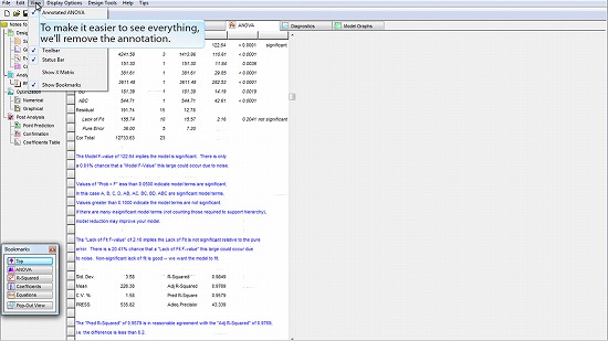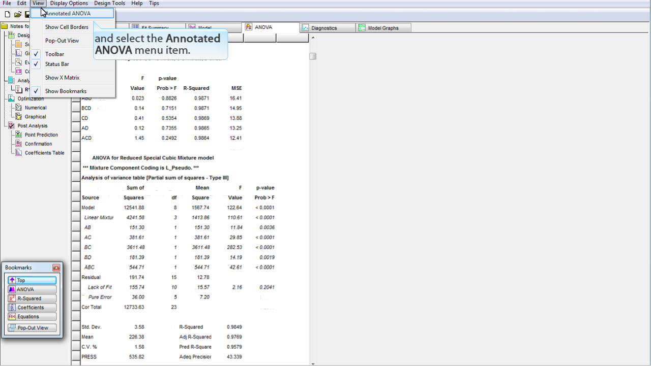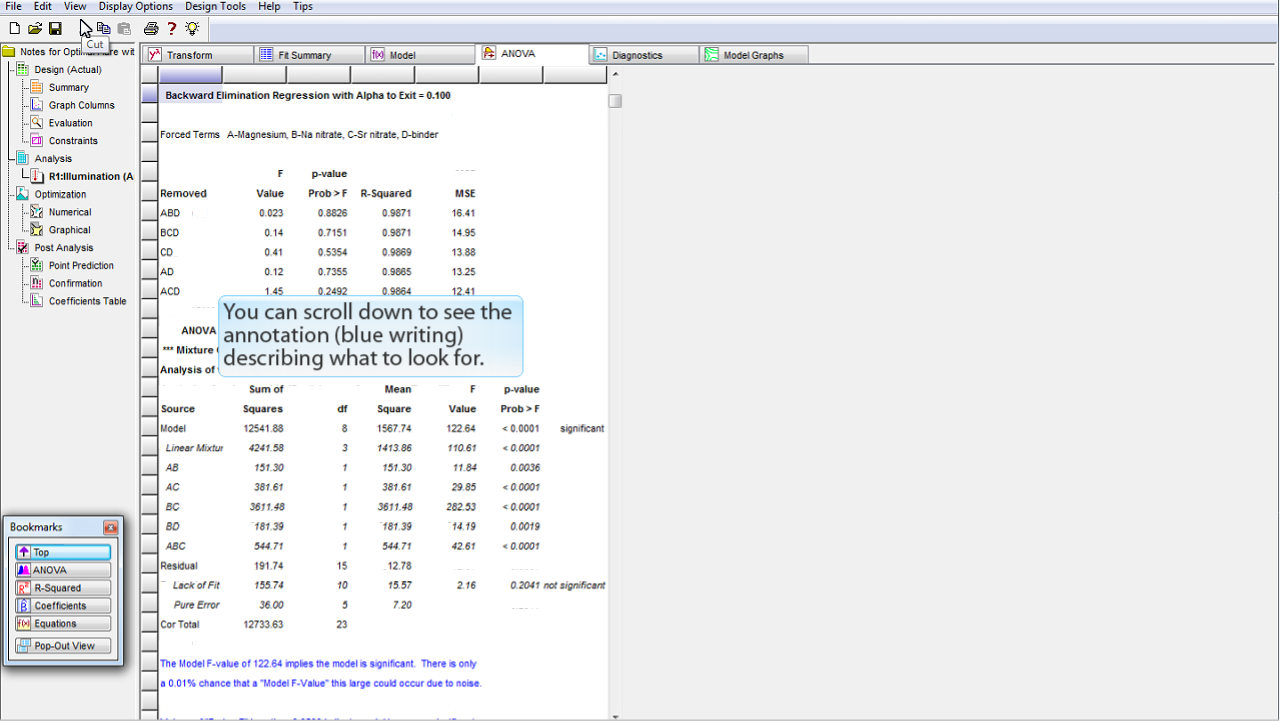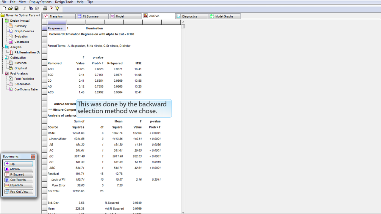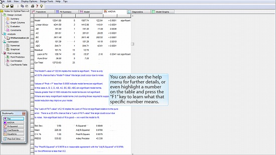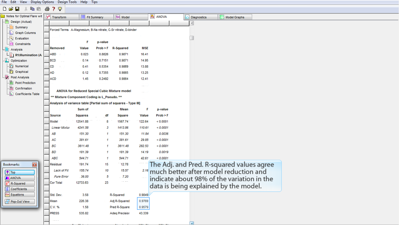ANOVA 分析が開きます。ここで、選択したモデルが統計的に有意なものか、それとも、データのランダムノイズに過ぎないものかをチェックするために統計的な分析を行います。