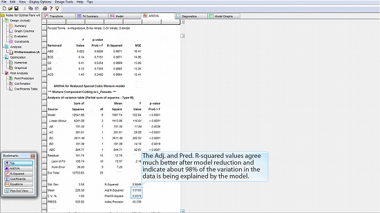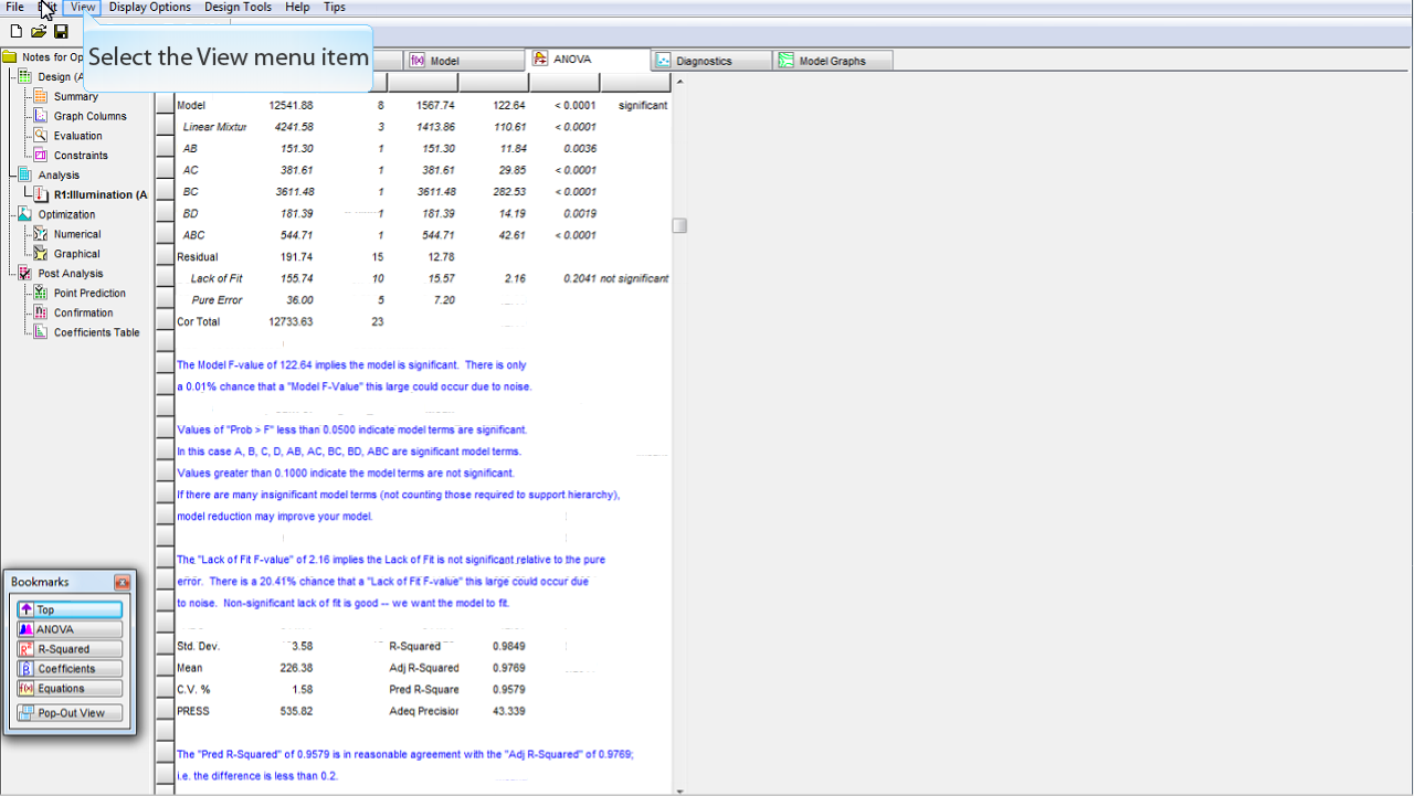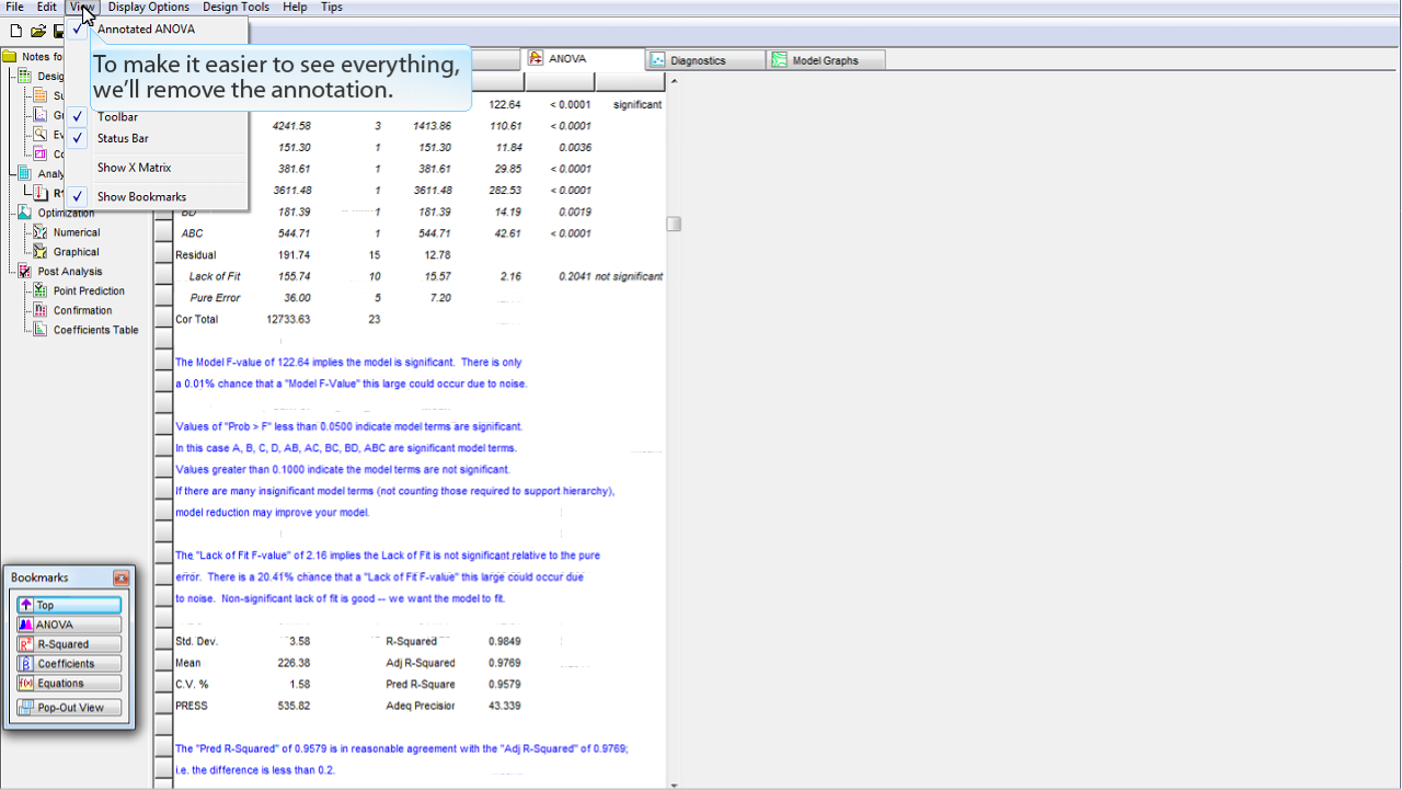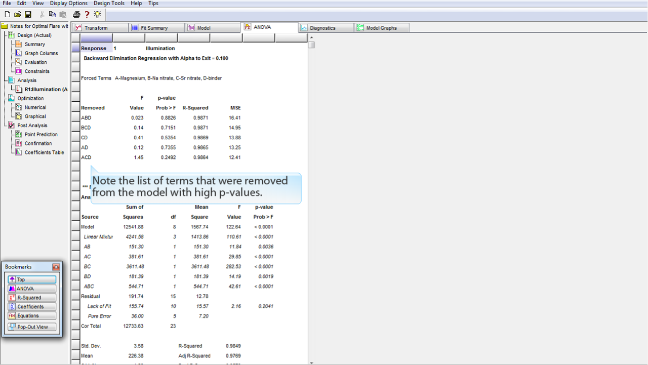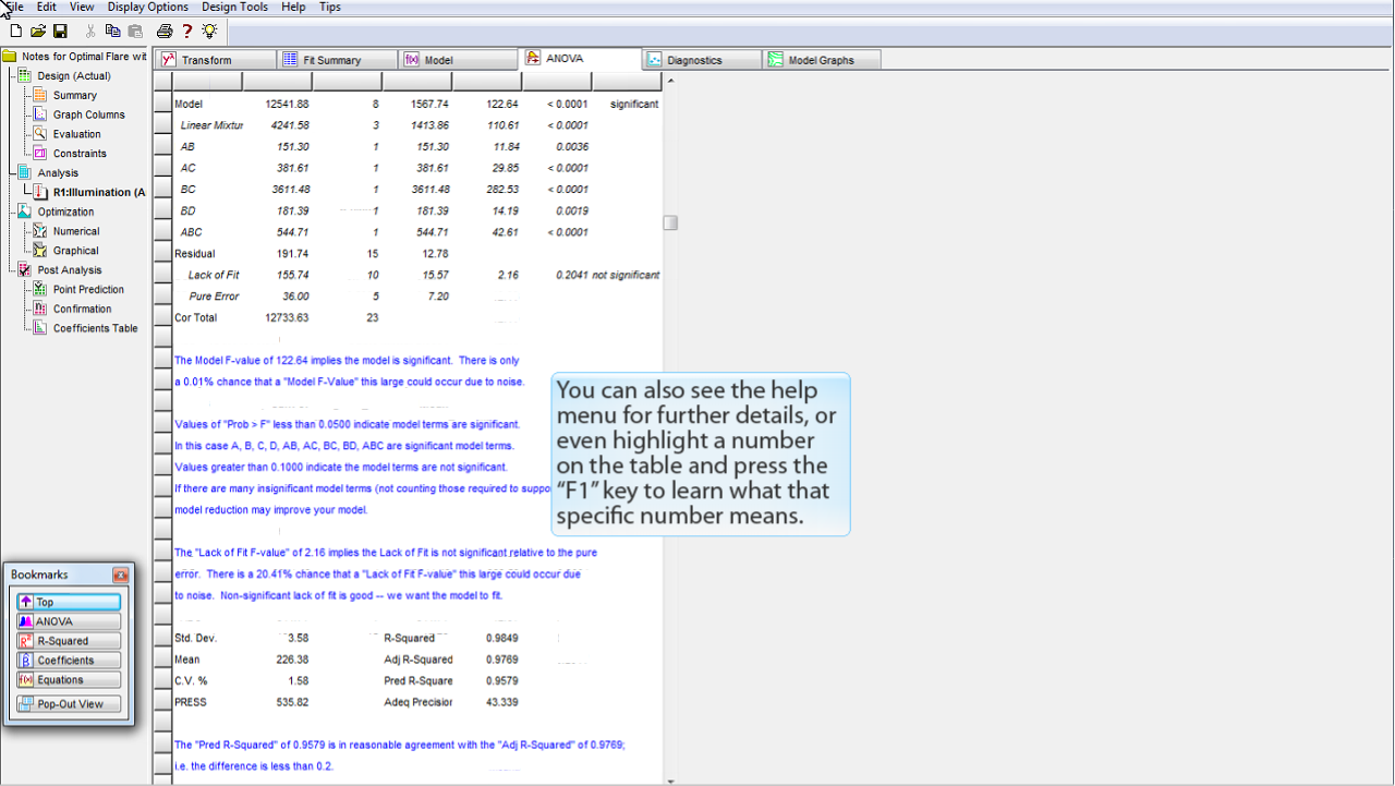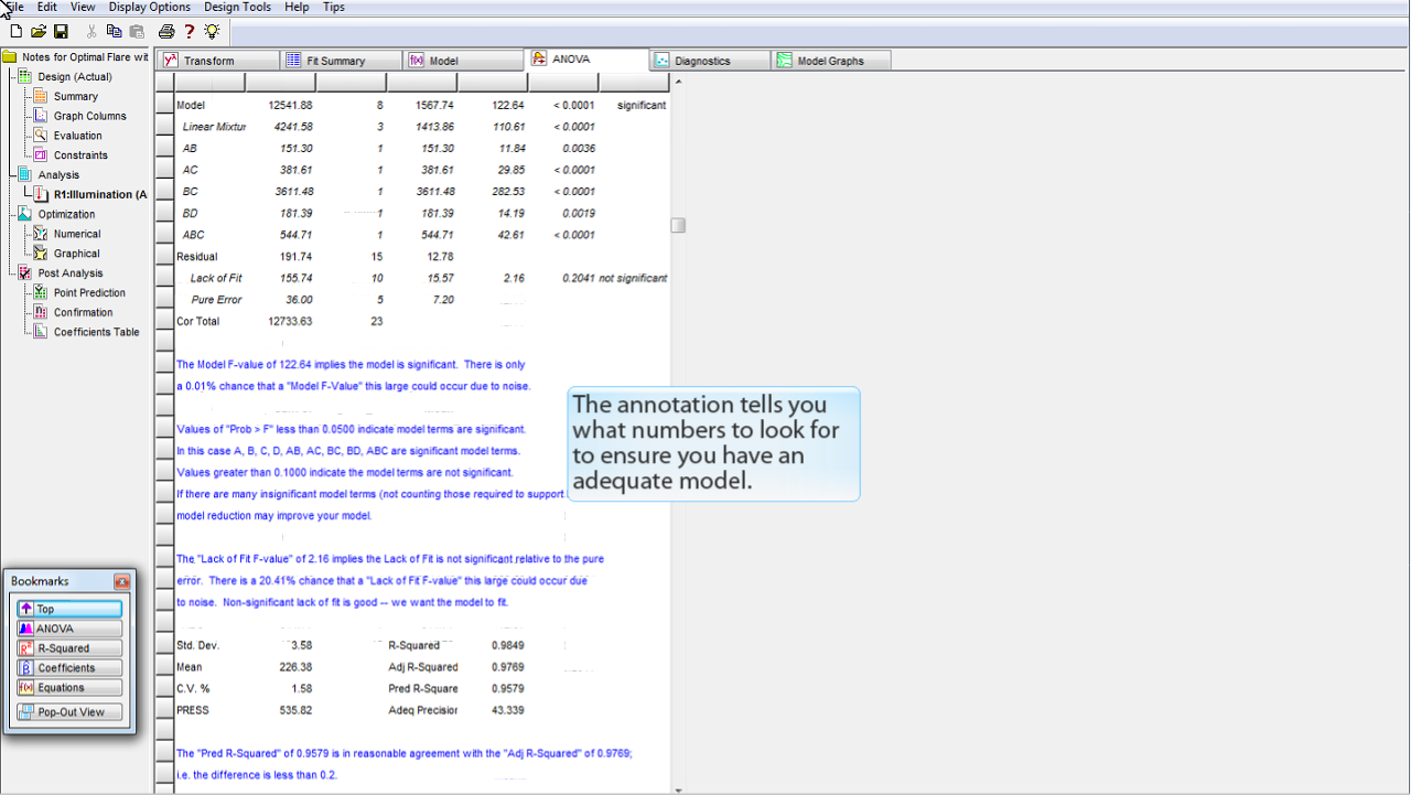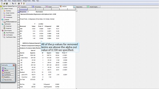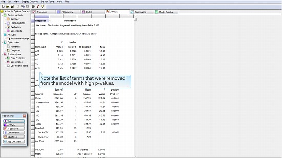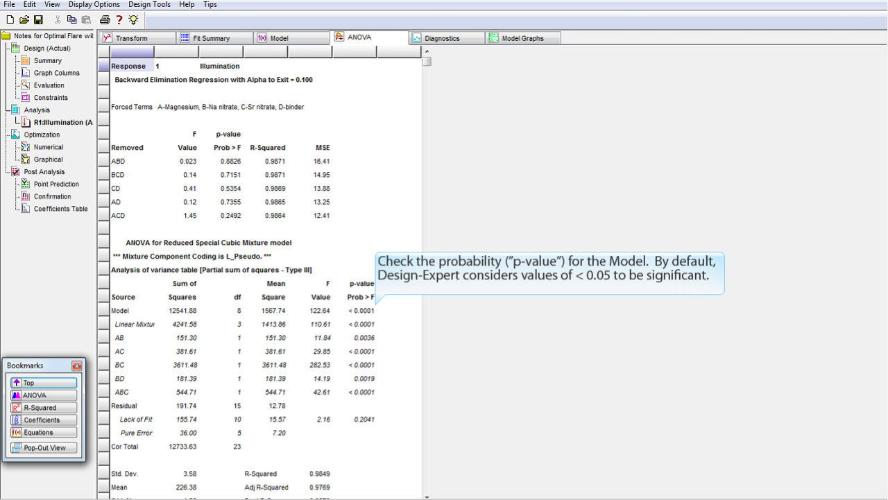 Model の確率 (p 値) をチェックします。Design-Expert のデフォルトは、値が < 0.05 で有意と設定されています。