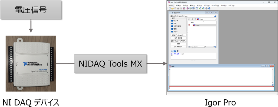 NIDAQ Tools MX は、Igor Pro 上で動作する「XOP (外部操作関数)」です。NI の DAQ デバイスを制御するためのドライバ「NI-DAQmx」と Igor Pro を結びつける役割を果たします。これにより、以下のことが可能になります。