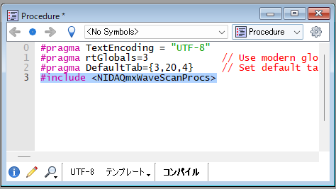 コンパイルが完了するとデータメニューに NIDAQ Tools MX という項目が追加され、NIDAQ Tools MX のプロシージャファイルが追加したサブメニューが表示されるようになります。