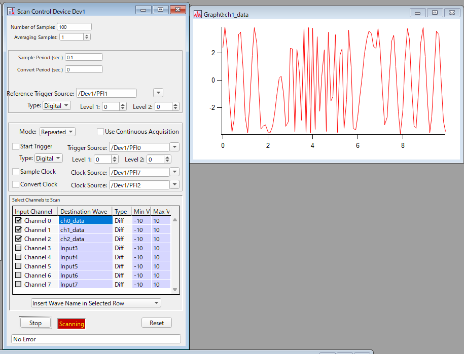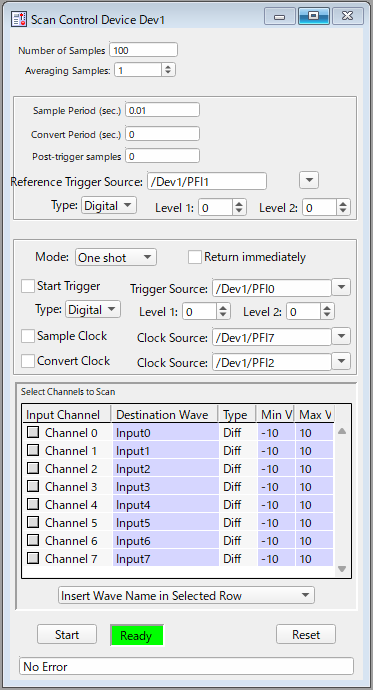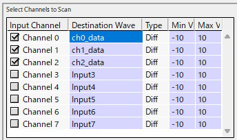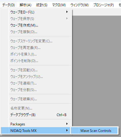 Igor Pro を起動し、メニューバーから データ -> NIDAQ Tools MX -> Wave Scan Panel を選択します。これにより、NIDAQ Tools MX の操作パネルが表示されます。