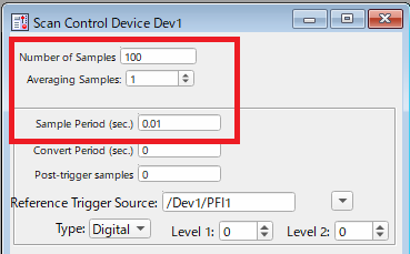 サンプリングレートや収集するサンプル数を設定します。例えば、0.01 秒間隔で 100 サンプルつまり合計1秒間のデータを収集するには次のように設定します。
